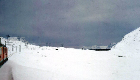 Höchst bedrohlich wirkt die Wetterlage: Wenig Sonne noch am Berninapaß - tief hängende schwarzgraue Schneewolken im Süden über dem Puschlav. Seit der Station Diavolezza überquert der Zug zahlreiche für den Fahrgast sinnlos erscheinende kleine Brücken. Das Gelände hier entlang des Berninabaches ist sehr offen und äußerst anfällig für Schneeverwehungen. So haben die Brücken einzig den Sinn, das Gleis in den Wind zu legen und von Verwehungen freizuhalten. Der Zug passiert die mit einem Schild gekennzeichnete Wasserscheide Schwarzes Meer - Mittelmeer. Weithin sichtbar ist die Staumauer des Lago Bianco, an dessen Ufer die Bahn ihren höchsten Punkt in der Station Bernina Ospizio erreicht: Bahnkilometer 22,3 in 2253 m Höhe. Die Bahnstation liegt direkt am Seeufer. Das Bahnhofsgebäude ist in sehr massiver Bauweise entstanden. Daneben steht in gleicher Bauweise ein weiteres Gebäude, das der Zug durchfährt. In diesem Gebäude ist wettergeschützt eine Drehscheibe und ein Standplatz für die Dampfschneeschleuder untergebracht.