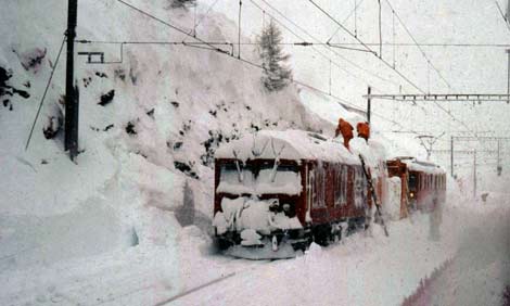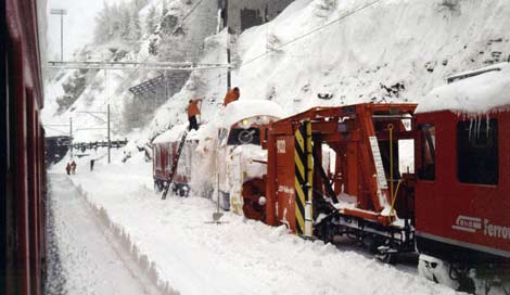 Erinnert sei beim Anblick des Kampfes gegen Schnee und Eis an die Lawinennacht von Alp Grüm am 28. Februar 1937. An diesem Sonntag hatte es durchgehend geschneit und es wurde befürchtet, daß Zug 28, der Tirano um 12.30 Uhr verlassen hatte, und Zug 29, der mit 2 Triebwagen und vorangestelltem Schneepflug ebenfalls mittags aus Pontresina abgefahren war, nur mit großen Verspätungen ihre Ziele erreichen würden.