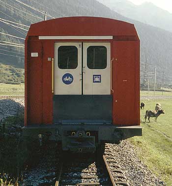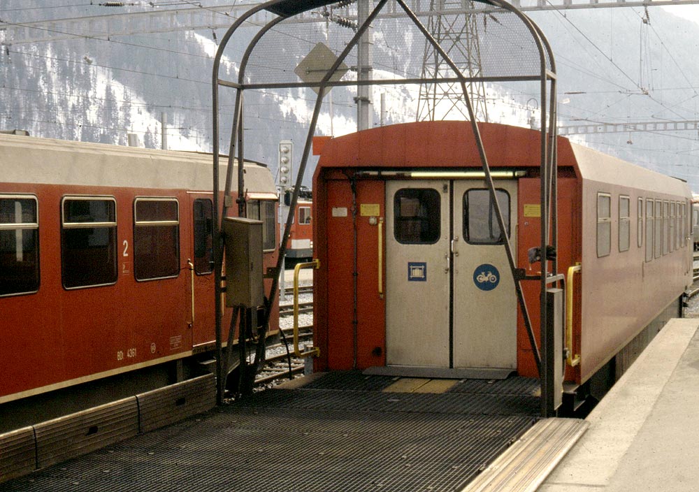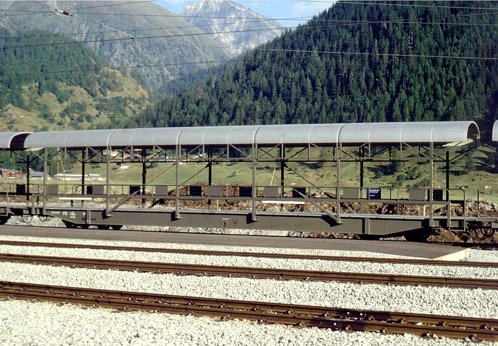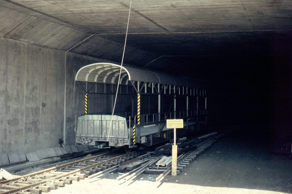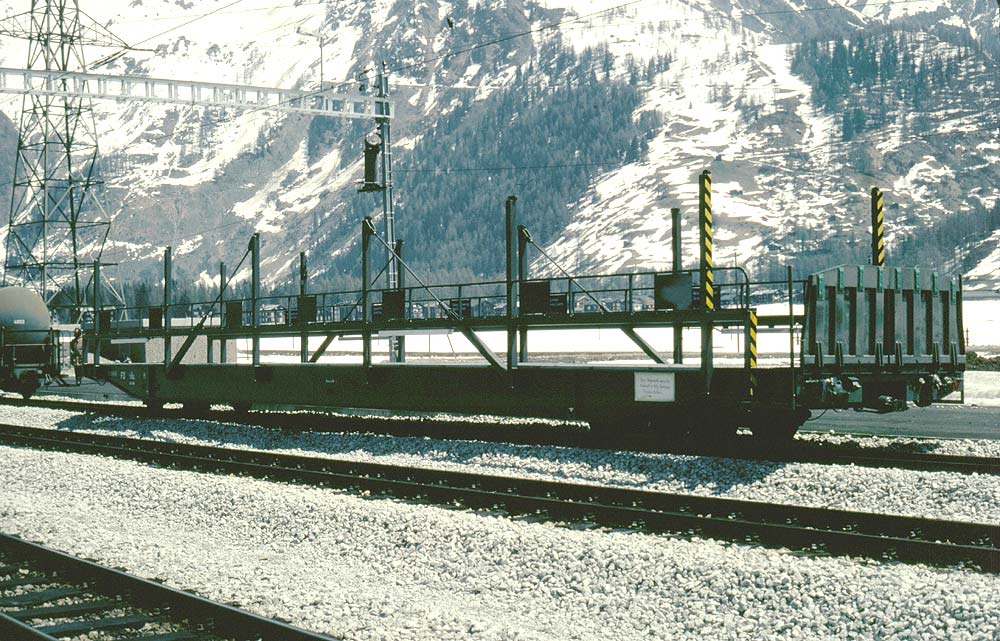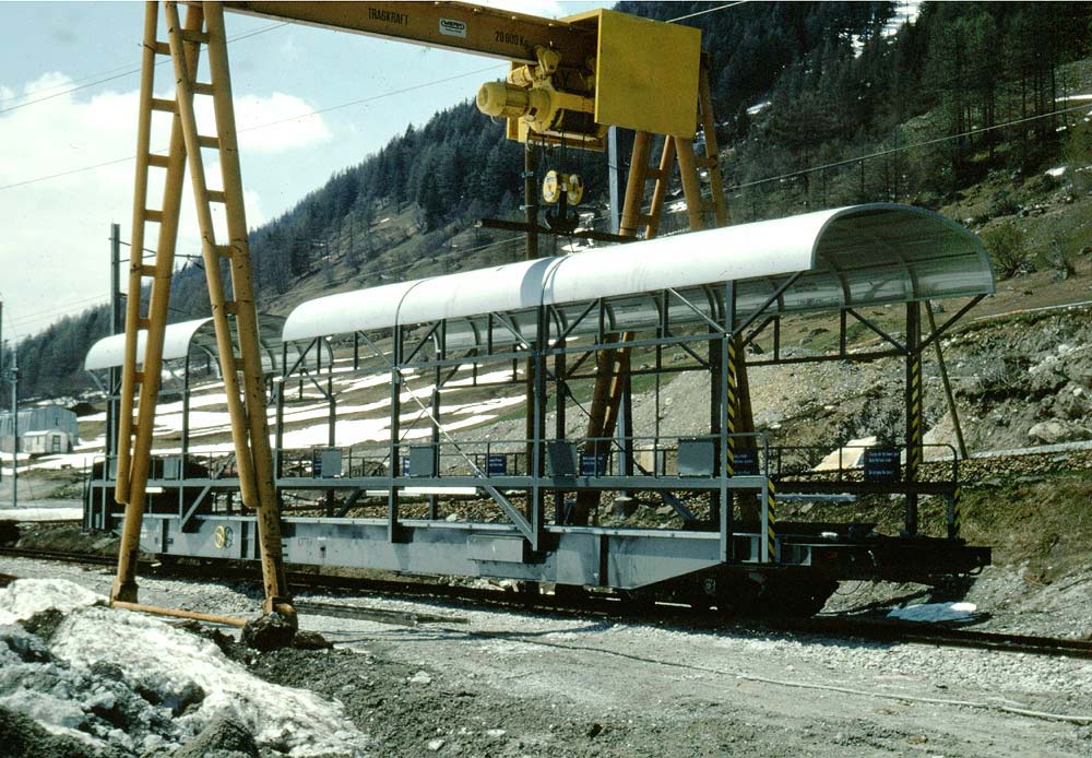 Der Umfahrtunnel Oberwald ist fertig, die Gleisanlage noch nicht. Einsam wartet der Verladewagen. Deutlich zu sehen ist die Blockkupplung