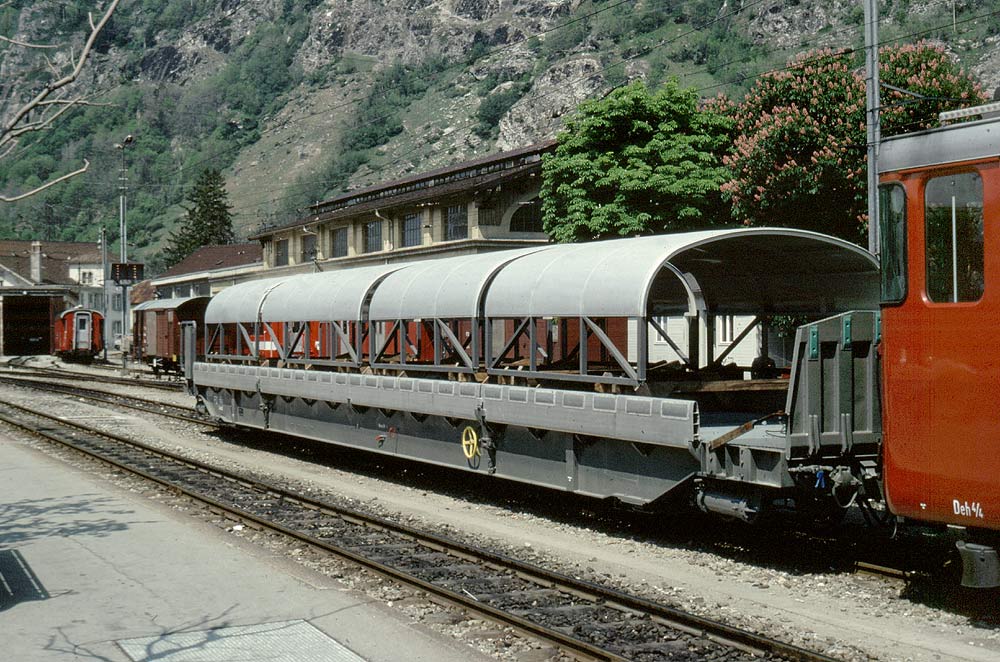 Verschub eines Rampenwagens mit aufgeladenem Verladewagendach im Bahnhof Brig mit Triebwagen Deh 4/4 51