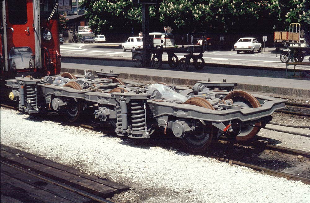 Die Drehgestelle der Verlade- und Rampenwagen im Bahnhof Brig
