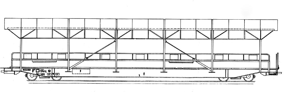 Vierachsiger Verladewagen (Autotransporter) FO, Serie Nr. Sklv 4811 - 4822 Anzahl: 12 Baujahr: 1980 Hersteller: SWS Schieren Gewicht: 41,4 t Ladegewicht: 20 t Ladefläche: 54,8 m² Maximale Ladehöhe: 3400 mm Breite des Wagenkastens: 2900 mm Höchstgeschwindigkeit: 90 km/h Bremsen: Oe, Laü, mFB, VL