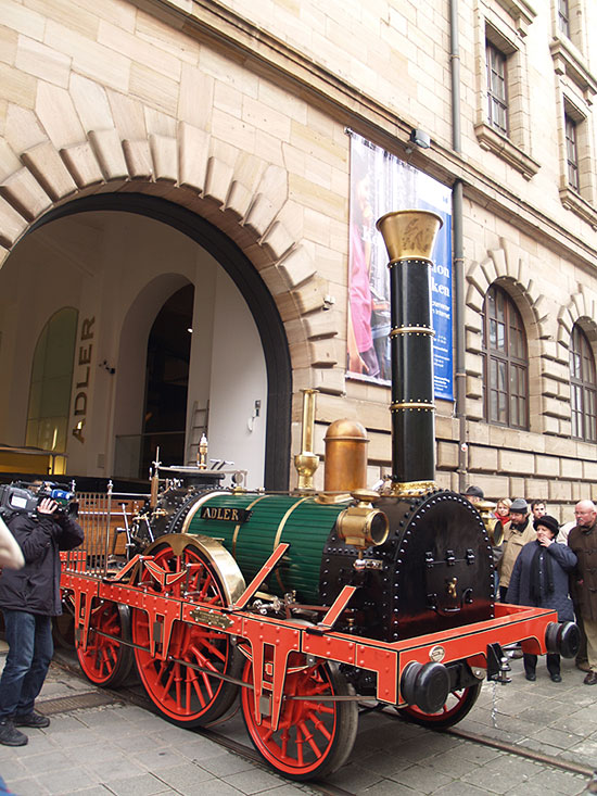 Der fahrbereite Nachbau der ersten in Deutschland gefahrenen Lokomotive ist wieder in Nürnberg. Bei dem Brand im Fahrzeugdepot des DB Museums im Oktober 2005 war der ADLER schwer beschädigt worden. Nach dem Wiederaufbau erstrahlt er nun in neuem Glanz.