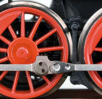 Rot nachlackiert werden sollten auch alle lediglich im Material durchgefärbten Kunststoffteile, etwa die Bremszylinder unter dem Führerhaus oder die Achslagerdeckel des Tenders. Mit den Farbunterschieden der Steuerung dagegen kann man gut leben. Bei allen Arbeiten ist äußerste Vorsicht angebracht. Dies um so mehr, als das beigelegte Faltblatt wenig hilfreich ist. Es taugt nur zur Ersatzteilnachbestellung, und man darf fürchten, daß die schneller notwendig ist, als einem lieb ist. In den meisten Punkten liest sich der Text der Betriebsanleitung ohnehin wie eine Drohung: “Laß‘ die Finger davon!”