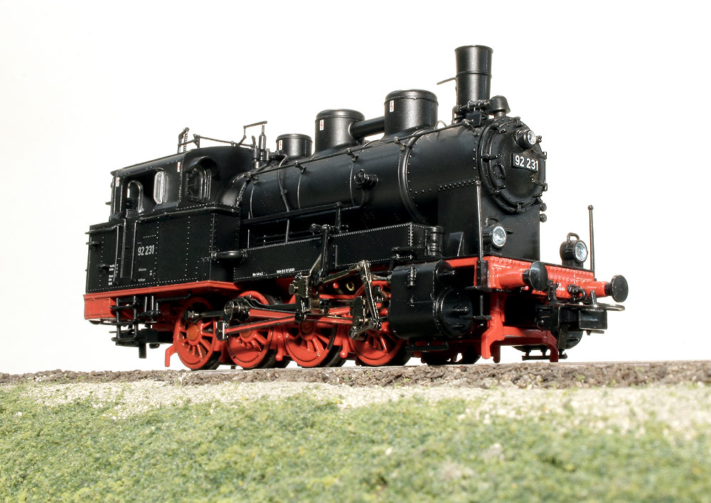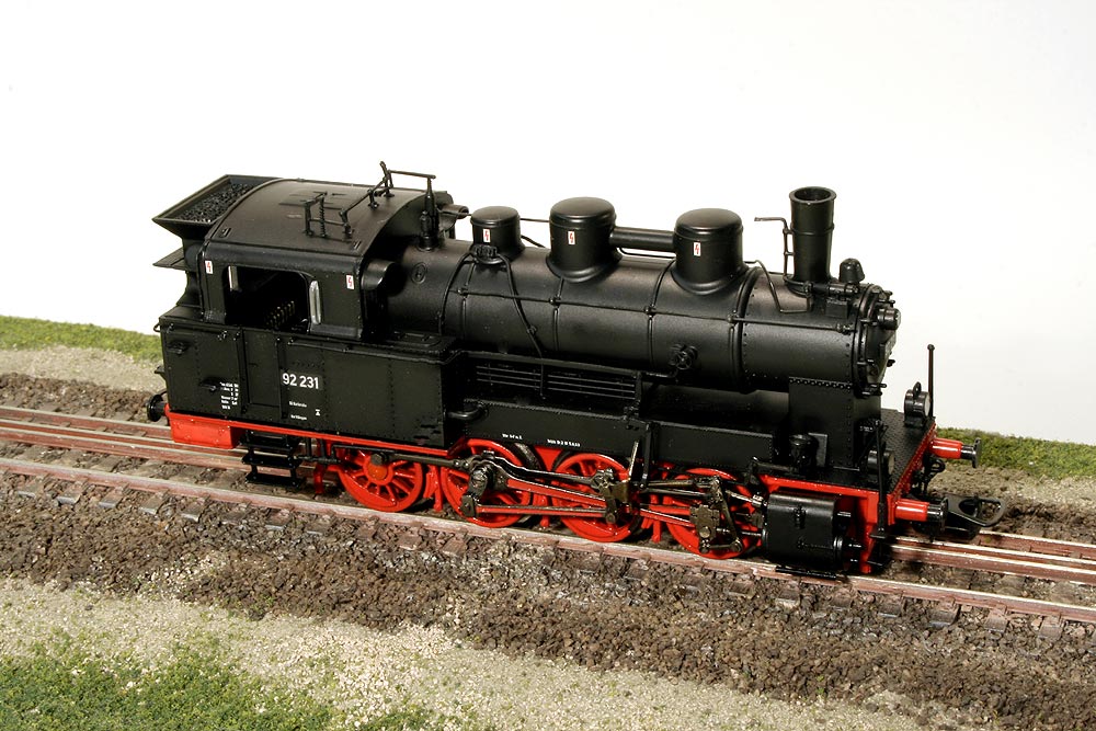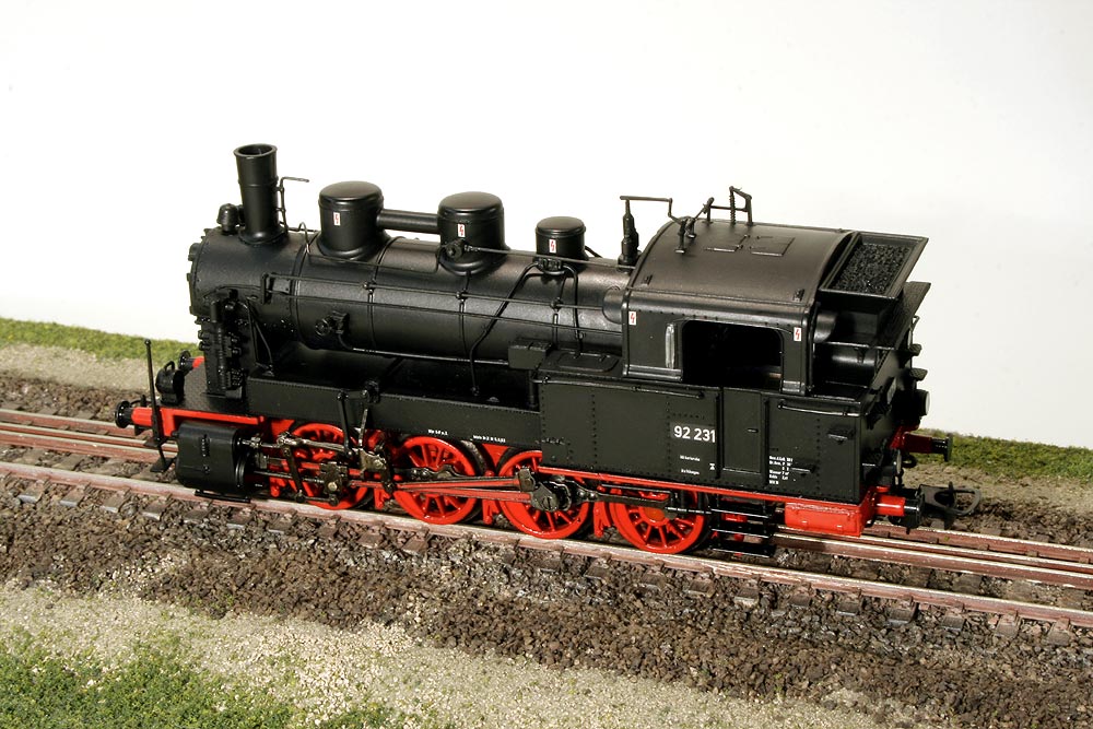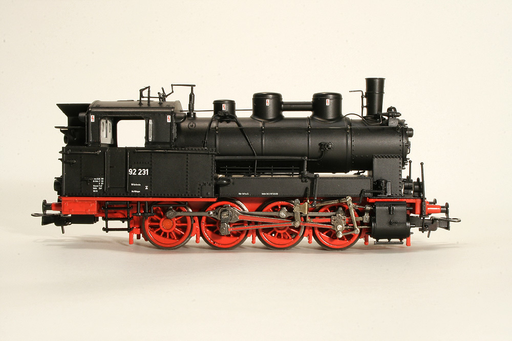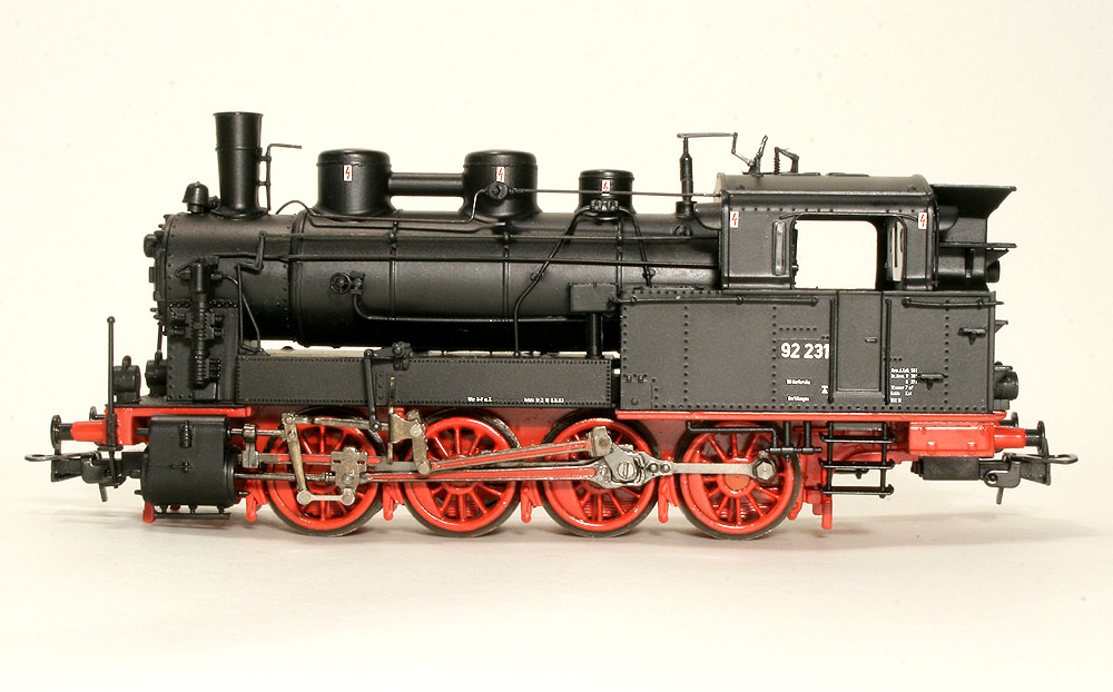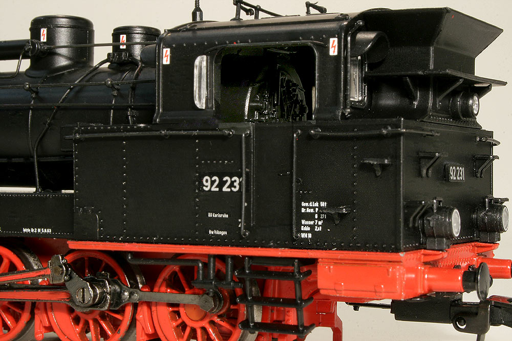 Liliputs 92 231 ist dem Bw Villingen zugeordnet, einem Eisenbahnknotenpunkt am südlichen Ende der Schwarzwaldbahn. Mit dem Revisionsdatum 5. August 1963 zeigt sich die Maschine im letzten Betriebszustand. Ein Bild, dem man sich gerne widmet. Der Detaillierungsgrad von Fahrwerk und Aufbauten ist dem der Konkurrenzmodelle deutlich überlegen. Dies gilt für die Leitungen am Kessel ebenso wie für das Abdampfdrohr der Lichtmaschine und das Gestänge auf dem Dach. Anders als etwa bei Brawa verliert die Lok dafür unterwegs nicht ihre Kleinteile. Der Führerhausdurchblick ist bemerkenswerterweise frei, und da die seitlichen Öffnungen vorbildgerecht groß sind, sollten hier Lokführer und Heizer eingeklebt werden.