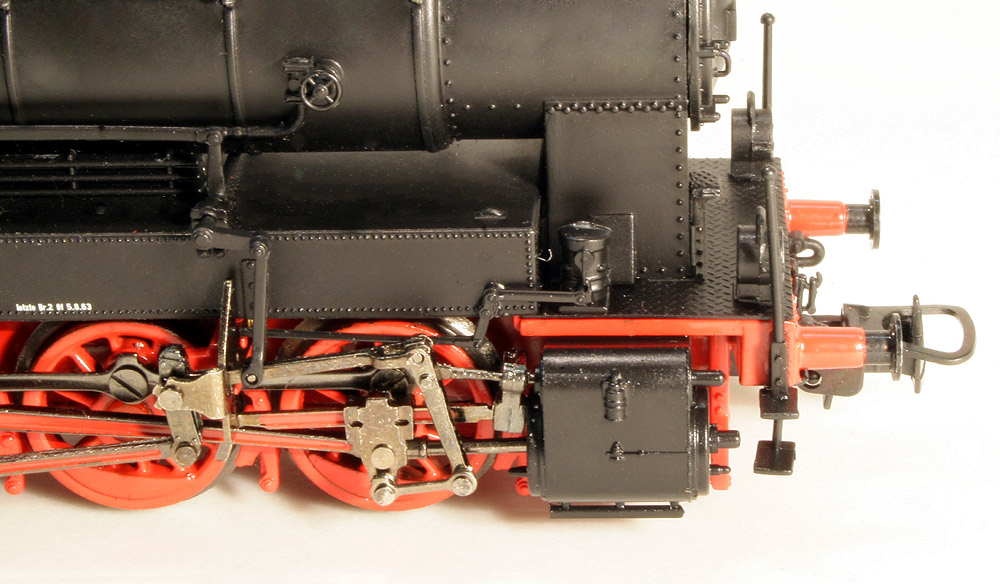 Die Beschriftung ist gut, wenn auch nicht gestochen scharf. Die Loknummer wurde glänzend unterlegt, was ein Nummernschild suggeriert, in diesem Fall jedoch überflüßig ist. Die Pufferbohlen können mit Zughaken und Bremsschläuchen bestückt werden. Im Grunde ist nur ein Minuspunkt zu verteilen: die obere Laterne des Dreilicht-Spitzensignals steht nicht frei, sondern erscheint als eine Art Warze der Rauchkammertür – eine Sitte, die lange Zeit viele schöne Fleischmannmodelle verdorben hatte.