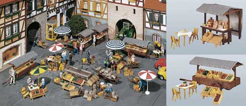 G: Auch Pola bietet Friedrich den Großen und Goethe & Schiller als Denkmäler an. Aus verschiedenartigen Marktständen läßt sich die gezeigte Szenerie gestalten. Daneben werden mehrere farbenfrohe Blumenkübel offeriert.
