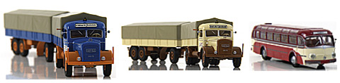 ▼ Kaelble K832L: Mit Metallchassis, lackierter Kabine und Pritsche, montierten Winkern und Außenspiegeln zeigt dieser LKW-Zug den Qualitätsstandard der TD-Reihe. Er wird sowohl in der beige/braunen Hausfarbe von Kaelble als auch in der Farbe der freien Bahnspediteure “Im Namen der DB” ab Februar ausgeliefert! ▼ MB 0 6600H: Mit Dachrandverglasung und attraktiver Zweifarbenlackierung erscheint erstmals ein ReiseBus in Top-Dekoration.