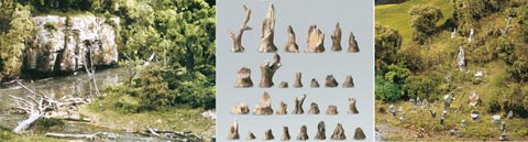 Abgestorbene Baumteile: Naturmaterial, koloriert. In der Landschaftsgestaltung als Treibholz, Gehölz und Stämme verwendbar. Baumstümpfe: abgebrochen oder abgesägt, je 14 Stück pro Packung, koloriert.
