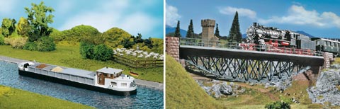 Motorlastkahn: für die Binnen-Schifffahrt auf den Modellanlagen. Abgedeckte Ladeluken und Steuerhaus. Nicht schwimmfähig. Wasserlinienmodell. Fischbauchbrücke: 47,2 cm lang, kpl. mit 2 geraden Gleisbetten à 18,8 cm und 2 Brückenköpfen. Für alle Modellgleise verwendbar.