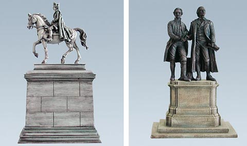 HO + G: Denkmal »Friedrich der Große«: Imposantes Reiterstandbild, für Parks und größere Plätze geeignet. Koloriertes Fertigmodell. Denkmal »Goethe und Schiller«: Das ideale Standbild für jeden Platz oder Park. Das Original steht in Weimar. Koloriertes Fertigmodell. Das Faller car system wird systematisch ausgebaut. Neben diversen neuen Bussen, LKws und Transportern werden auch Fahrzeugpackungen mit Ladeakku angeboten. TT: Diese Baugröße erhält Zuwachs aus 3 früher im HO-Programm angebotenen Einfamilienhäusern. N: Für die Maschinenfabrik erscheinen ein Hauptgebäude, ein Kesselhaus mit Schornstein und eine Packung mit 2 Fabrikhallen. Neben einer BP-Tankstelle der Fünfziger Jahre und mehreren Siedlungshäusern wird auch die oben abgebildete HO-Brücke in diesem Maßstab erhältlich sein. Z: Eine Maschinenfabrik und ein Dorfset (3 Häuser mit Kirche) bereichern bald die Z-Anlagen.