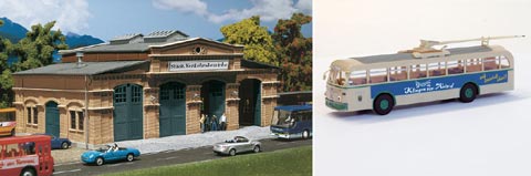 Bus-Depot mit Fahrzeug: In 4 weiträumigen Hallenunterständen finden Busse der öffentlichen Verkehrsbetriebe reichlich Platz. Die Tore sind manuell zu öffnen und zu schließen. Ein bedruckter »Wilkinson«-Bus liegt gratis bei.