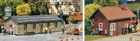 Baracke: Eine Bauarbeiterbaracke mit teerpappegedecktem Dach, wie Sie auf unterschiedlichen Baustellen zu finden ist, aber auch im älteren Kleintrieben der 50er-Jahre zum Einsatz kam. Mehrfach hinter und nebeneinander baubar. Preußische Bahnbude: in der klassischen, roten Klinkerbauweise. Vielseitig im Bahn- und Schrankenwärterbereich einsetzbar.