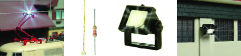 Pantographen-Blitzer Dieser verblüffende Effekt simuliert den Abreißfunken am Pantographen einer fahrenden E-Lok. Er besteht aus einer sehr kompakten Elektronik und einer blauen Micro-Leuchtdiode. Zum einfachen Einbau in E-Loks der Baugröße H0, TT und N. Der Anschluss erfolgt einfach parallel zum Lok-Motor. Flutlichtstrahler, mit LED Zum Anstrahlen von Gebäuden, Denkmälern, Werbetafeln und zum Einbau in Kirmesmodelle werden kleine, aber helle Strahler benötigt. Durch den Einsatz von reinweißen LEDs ist dieser Strahler sowohl kompakt als auch sehr hell und kann deshalb diese Aufgaben optimal erfüllen. Er ist sogar als Bühnenstrahler geeignet. Das Gehäuse hat die Maße von 5,5 x 4,5mm, der Strahler ist schwenkbar ausgeführt. Durch die LED Technologie ist der Strahler zudem äußerst sparsam in der Stromaufnahme.