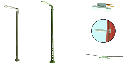 Bahnsteigleuchte Wallau, mit LED Das Vorbild dieser Leuchte steht im nordhessischen Wallau. Sie schließt eine Lücke im Programm der Bahnsteig- und Bahnbetriebswerksleuchten. Diese Bahnsteigleuchte mit dem filigranen Messingmast und dem Schirm einer Peitschenleuchte eignet sich zur Illumination aller Bahnanlagen ab der späten Epoche III. Bei dieser Leuchte wird die moderne LED Technologie eingesetzt. Die Bahnsteigleuchte hängend und die Industrieleuchte sind Weiterentwicklungen der bekannten Viessmann – Produkte, „Bahnsteigleuchte hängend“ 6365 und „Industrieleuchte“ 6089. Auch bei diesen Leuchten findet jetzt die moderne SMD-LED Technologie Verwendung. Diese LEDs erzeugen besonders helles reinweißes Licht bei gleichzeitig sehr geringer Stromaufnahme von 10mA statt 30mA wie bei einer herkömmlichen Glühlampe. Da die LEDs besonders wenig Wärme abstrahlen, konnte der Lampenschirm komplett neu konstruiert werden. Deshalb wirken diese Leuchten besonders filigran. Hängelampe mit Seilaufhängung, mit LED Auf vielen Bahnhöfen und auch in Innenstädten finden sich Lampen, die an Seilen zwischen Masten oder auch Gebäuden aufgehängt werden. So kann diese Leuchte zum Beispiel zur Darstellung einer Geschäftsstraße mit Straßenbahngleisen oder auch zur Beleuchtung eines von Oberleitung überspannten Gleisfeldes verwendet werden. Auch hier wird eine moderne SMD-LED eingesetzt. Diese Leuchtdiode zeichnet sich durch besonders helles weißes Licht bei sehr geringer Stromaufnahme aus. (10mA statt 30mA wie bei einer herkömmlichen Glühlampe. Flackerschutz Ergänzung zu den Waggon-Innenbeleuchtungen 5046, 5047 und 5049. Ein durch kurze Stromunterbrechungen (verschmutzte Gleise oder Räder) verursachtes Flackern der Waggon-Innenbeleuchtung wird hiermit wirkungsvoll unterdrückt. Dieses kleine Modul wird zwischen die Radschleifer oder stromführenden Kupplungen und der Waggon-Innenbeleuchtung gesetzt. Geeignet für AC, DC und Digital. Als weitere Neuheit ist ein Gleisbildstellpultsystem angekündigt.