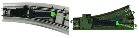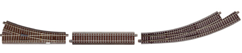 HO: Das Gleissystem Roco geoLINE ist ein kostengünstiges Gleissortiment. Es vereint die Ansprüche, die heute an ein Gleis gestellt werden. Schon seit einiger Zeit gab es im Hause Roco Überlegungen, das ROCO LINE®-Schienensystem weiter zu verbessern. Aufbauend auf dem vorhandenen ROCO LINE®-System sollten dabei auch die zahlreichen Anregungen der Endverbraucher berücksichtigt werden. In Profil und Höhe – und auch bei der Trittfestigkeit sowie in Farbgebung und Detaillierung – entspricht das neue Roco geoLINE dem bekannten ROCO LINE® Bettungsgleis und ist mit diesem kompatibel. Ein absolutes Novum dabei sind jedoch die verbesserten Steckverbindungen an den Gleisenden, die das Zusammenfügen der Gleisstücke kinderleicht machen. Einfach und schnell werden die Schienenstücke über die unter der Bettung angebrachten Kunststofflaschen ineinander geführt und die Gleise sicher über die zusätzlichen Schienenverbinder verbunden. Diese gleiten durch die exakte Führung dabei wie von selbst übereinander - versetzte Gleisübergängen gehören der Vergangenheit an. Auch der Gestaltung der Gleisbettung haben sich die Konstrukteure angenommen. Das Schotterbett wurde für einen garantierten spaltfreien Gleisübergang versteift, Dämpfungsrippen unter der Bettung garantieren jedoch weiterhin einen geräuscharmen Lauf der Triebfahrzeuge und sorgen zusätzlich für Trittfestigkeit. Ein weiteres Plus des neuen geoLINE-Schienensystems – die Gleisbettungen müssen beim Verlegen des Gleises im Weichenbereich nicht mehr beschnitten werden, da das Gleisbett nun schmaler gehalten wurde. Der Einbau von separaten Anschlußschienen ist nicht mehr notwendig, künftig kann an jeder beliebigen Schiene, auch bei Bogenstücken (außer bei Weichen oder Entkupplungsgleisen), an einer ab Werk definierten Stelle der Strom eingespeist werden. Ein in der Bettung eingebauter Kabelkanal verdeckt unschöne Kabel, Einbaumulden sind für die Aufnahme von Schaltkontakten vorgesehen. Drei Radien werden geboten: Bogen R 2 = 358 mm/30°. Bogen R 3 = 434,5 mm/30°. Bogen R 4 = 511,1 mm/30°.