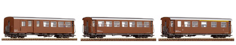 Zur Mh gehören die Wagen der Mariazeller Bahn: Packwagen, Personenwagen 2. Klasse und der Personenwagen 1./2. Klasse in brauner Lackierung.