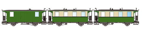 Dazu passend 3 Rügen’sche Wagen: Packwagen und Personenwagen mit Holz- und Blechaufbau.