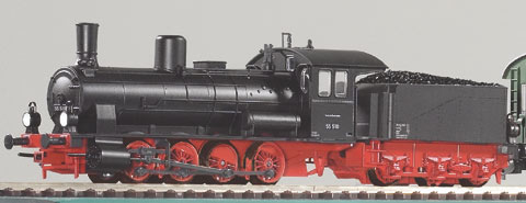 HO: Nach langer Ankündigung ist die BR 55 (G7.1) fertig. Die Lok erscheint im preisgünstigen PIKO Hobbyprogramm. Das Modell wird als Version für DB und DR angeboten und erscheint als Gleich- und Wechselstromausführung. Die Technik der Lok ist sehr gut. So treibt ein Motor mit Schwungmasse im Tender alle drei Achsen an. Eine Digitalschnittstelle ist vorhanden. Sound und Rauchgenerator können nachgerüstet werden.