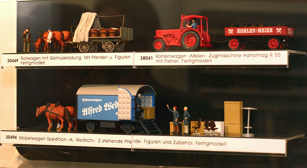 Im Zubehörbereich gestaltet Faller ein breites Neuheitenprogramm zwischen dem Lutherhaus und dem Berliner Fernsehturm. In vielen Anlagenecken wird das Modell bald zu finden sein. Preiser greift den Trend der beweglichen Figuren auf und läßt Bauarbeiter, Fahrdienstleiter und Polizisten die Ärmchen schlenkern. Wozu man Babies in H0 benötigt, einen Vampir in Nenngröße II oder einen pferdebespannten Holzmöbelwagen, der Computermöbel transportiert gehört in die Rubrik der künstlerischen Freiheit, aber nicht auf eine ernsthaft gestaltete Modellbahnanlage – so die Meinung des Verfassers, der dies bei heimlich belauschten Gesprächen des Publikums am Stand bestätigt fand. Heki brachte die “wirklich” großen Kiefern ein weiteres Mal nicht - aber versucht mit Häusermodellen auf bedrucktem Karton, ein neues Feld zu erobern. Auhagen hat mit dem altbewährten “Wiederverwendungsgedanken” vorhandener Formen mehr Geschick bewiesen als ein Mitbewerber. Das Umgebindehaus ist zu einer Dorfschmiede verändert worden, was erst beim zweiten Blick auffällt. Respekt, auch für die avisierte Großbekohlungsanlage in TT.