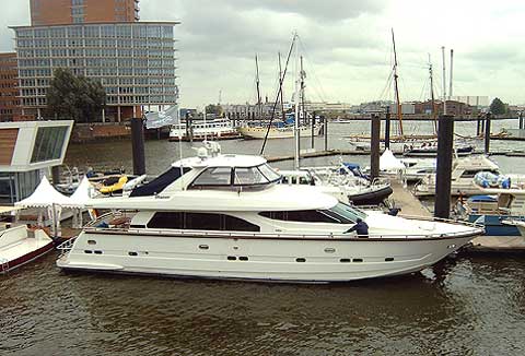 Auch große Motoryachten wie die mit knapp 24 Metern größte Motoryacht der diesjährigen hanseboot, die Elegance 76 New Line, oder die Fleming 55 mit ihren vom Bug bis zum Heck gemessenen 18,50 Metern werden im hanseboot-Hafen festmachen und stehen nach vorheriger Absprache auch für Probefahrten auf der Elbe zur Verfügung.
