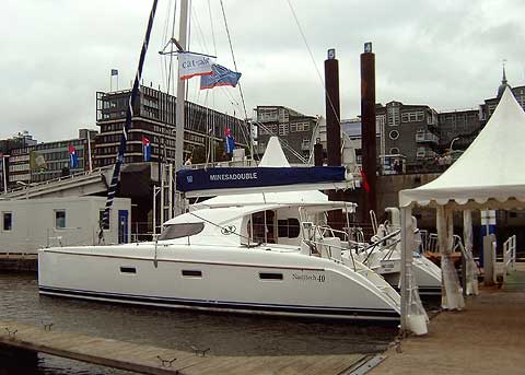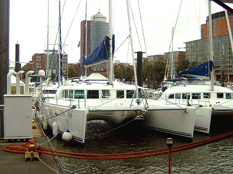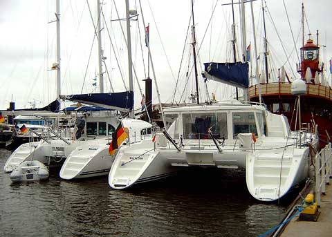 Festgemacht zur 47. Internationalen Bootsaustellung Hamburg haben im Hafen unter anderem der Edelcat Broadblue 385 aus England, französische Mehrrümpfer des Typs Lagoon und Nautitech sowie ein großer Katamaran der Lübecker Baltic Werft.