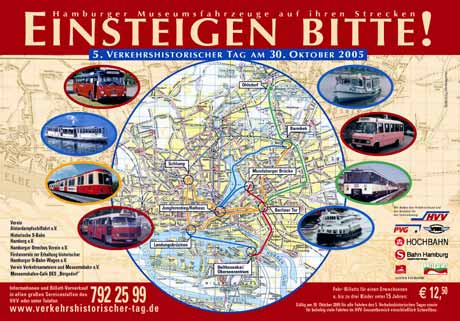 Am Sonntag, dem 30.Oktober 2005, wird zum 40. Geburtstag des HVV (Hamburger Verkehrsverbund) der Nahverkehr der Sechziger Jahre wieder lebendig. Zum 5. Verkehrshistorischen Tag werden die aktiven Hamburger Museumsfahrzeuge von 10 bis 18 Uhr auf ausgewählten Strecken zu einem abgestimmten Fahrplan im Einsatz sein. Besondere Attraktionen sind der weltweit einzige Gesellschaftszug auf U-Bahn-Gleisen, der 1958 gebaute HANSEAT vom Typ DT1. Seit einem Jahr ist auch der Einsatz der in den Sechziger Jahren gelieferten Bauart DT2 Vergangenheit. Auch ein Zug dieser Bauart wird daher am Verkehrshistorischen Tag eingesetzt. Auf den Gleisen der S-Bahn rollt der letzte bis 2002 im Plandienst eingesetzte Altbau-Triebzug der Baureihe 470 aus dem Jahr 1969. Mit zwei Sonderlinien verbinden Omnibusse der Fünfziger bis Siebziger Jahre die zahlreichen Umsteigepunkte für eine Reise kreuz und quer durch den Hamburger Nahverkehr vergangener Jahrezehnte. Eine Hamburgische Spezialität sind die Wasserstraßen: Dort kann erstmals nach umfangreicher Restaurierung die Alsterbarkasse “Aue” als Museumsschiff der ATG Alster-Touristik auf ihrer alten Stammlinie vom Jungfernstieg zur Mundsburger Brücke eingesetzt werden. Hamburgs einziger echter Alsterdampfer, das 1876 auf der Reiherstiegwerft gebaute Dampfschiff “St. Georg” verkehrt zwischen Jungfernstieg und Barmbek. Im Hafen pendelt die ehemalige HADAG-Fähre “Bergedorf”, ein Diesel-Elektro-Schiff von 1955, von den Landungsbrücken zum Anleger Holthusenkai . Der Betrieb auf dieser Fährlinie wurde 1979 eingestellt.