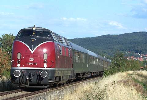 Die Fahrt mit der legendären Diesellok V200 und den grünen Eilzugwagen der Sechziger Jahre beginnt in Hattingen im Ruhrtal und führt über Hagen Hbf auf die Ruhr-Sieg-Strecke durch das Siegerland, das entlang der Lenne mit starken Steigungen und vielen Tunnels durchquert wird. Ab Siegen geht es weiter über die Dill-Strecke bis Wetzlar. Hier ist abermals ein Richtungswechsel, ehe es auf die Lahntalbahn Richtung Limburg geht. Die Strecke verläuft entlang des Flußlaufes und überquert die Lahn auf zahlreichen Brücken. Wahrlich atemberaubend ist die Schönheit dieser Strecke, die sich wie der Fluß durch die Landschaft schlängelt.
