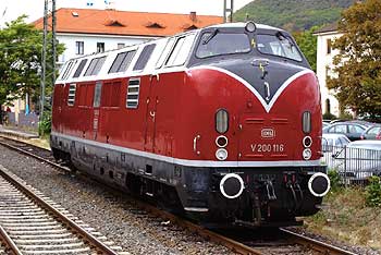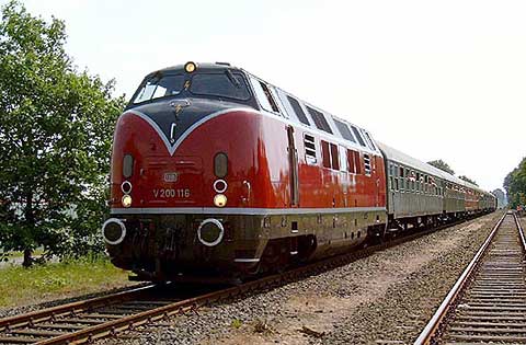 Die komfortablen vierachsigen Wagen versprechen eine angenehme Reise, wie schon damals, vor mehr als vierzig Jahren. Wahrzeichen der damaligen Bundesbahn war die legendäre Großdiesellok V200, die den endgültigen Abschied der Dampflokomotiven von der Schiene einläutete. Die stilechte Zuggarnitur bestehend aus den grünen Wagen der 1. und 2. Klasse wird von der Oberhausener Diesellok 221 116 gezogen. Ein roter Speisewagen gehört bei dieser Fahrt mit zum Zugverband.