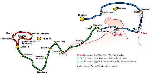 Start ist am 28. August 2008 um 12.01 Uhr auf dem historischen Hauptmarkt in Zwickau. Gleich am ersten Tag steht eine besondere Herausforderung im Roadbook: Nachdem die "Steile Wand" in Meerane überwunden worden ist, wird zur Sonderprüfung auf der 3,7 Kilometer langen GP-Strecke des "Sachsenrings" gestartet.